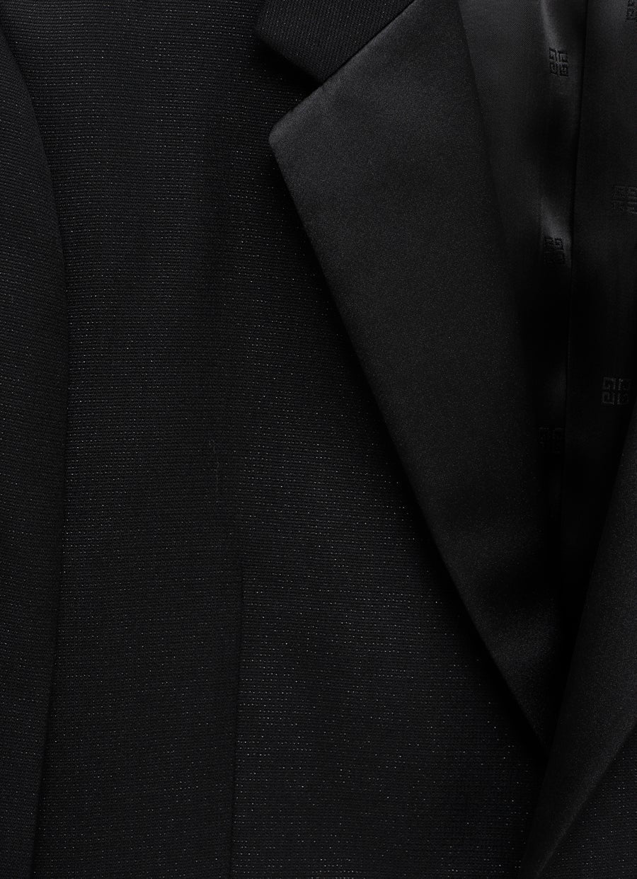 Chaqueta smoking de Givenchy en lana con acabado brillante, cierre de botón frontal oculto, solapas de satén, bolsillos frontales y forro de cupro 4G. Corte slim. Hecha en Italia. Tallaje Italiano para hombre.